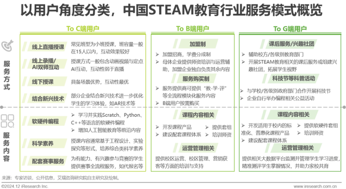 STEAM教育行业涉及的服务方式与服务内容根据服务对象不同有较大差异。C端用户主要指学生及家长,企业提供的服务内容主要是通过各类授课形式,为用户提供编程类课程、科学素养类课程与配套赛事服务。B端用户主要指大型企业的加盟商或小型STEAM教育机构,服务方式分别是加盟制和服务购买制,服务内容主要包含开发课程与培训师资的课程服务,校区运营与客群获取的运营服务。G端用户主要指学校或各级别教育相关部门,服务方式主要包含课后服务、兴趣社团、科普活动等,其服务内容涵盖全流程授课,如课程研发、师资培训、学生管理与测评等。