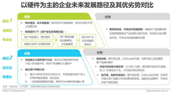 上述两类主营硬件类的企业,目前总体呈现出两类发展路径。第一类路径是“高端化、专业化”方向,该方向的优势是产品辨识度较高,且业内其他企业难以复刻,且能够有效提升用户全生命周期的价值;但该类企业的产品通常选择通过闭源建立企业护城河从而导致市场兼容性较低,未来市场合作的拓展也较为困难。第二类路径是“低价化、普惠化”,该方向的优势是能够快速建立大面积的用户认知,且低价低龄化产品还有利于通过娱乐异业合作的方式更早的触达大量用户;但该类企业的产品复刻性难度较低,产品护城河较弱则对企业成本把控能力提出更高的要求,除此之外,低价策略可能导致利润不足,从而放慢产品迭代速度,增加被市场淘汰的风险。