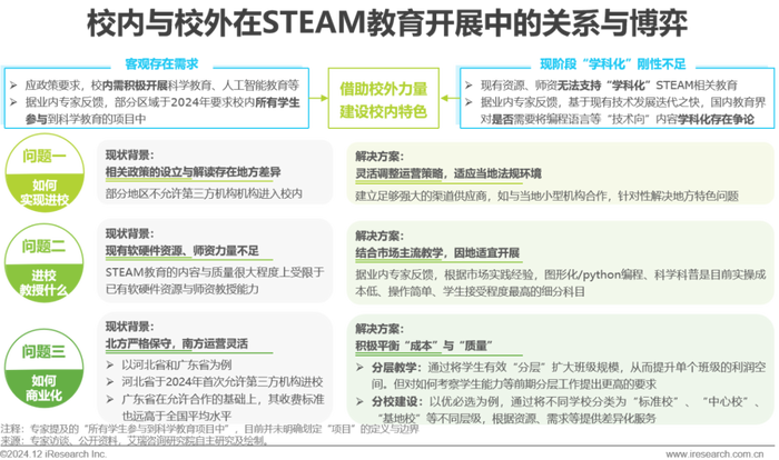虽然目前应政策要求,校内存在积极开展科学教育、人工智能教育的需求,但现阶段该类教育“学科化”刚性不足,“校内借助校外力量建设特色,校外借助校内力量实现用户教育”便成为现阶段最优的发展路线。但该路线实施过程中依旧存在三大问题,首先企业需要根据当地政策灵活调整运营策略,以解决“如何进校”的问题;其次企业需要结合市场主流教学,因地适宜开展部分科目,以解决“进校教什么”的问题;最后企业需要积极平衡“进校成本”与“教学质量”,以解决“如何商业化”的问题。