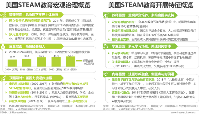 美国国家科学基金会于1986年发布《科学、数学和工程本科生教育》报告,由此拉开美国STEM教育的序幕;奥巴马执政后,STEM教育由高等教育阶段开始拓展至K12阶段,并陆续出台教育规划、师资培训等文件。此后美国STEAM教育在宏观治理上形成了“管理层面总协调下多元主体参与”、“资金层面高额经费投入”、“顶层设计重视力度逐步加强”的特征,形成“教师层面重视师资培养,多维度提供支持”、“学生层面提供多元学习场景,关注弱势群体”、“内容层面注重职教融合,紧跟时代发展”的特征。