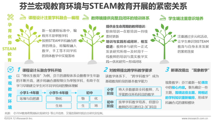 芬兰是目前为STEAM教育提供了最优秀基础教育土壤的国家之一,芬兰在基础教育阶段的完整课程设计以融合学科为起点,该课程设计即要求所有基础教育阶段的老师均掌握“跨学科教学”的能力,除此之外芬兰最新一轮的课改进一步提升了学科融合式教学的重要性,这为发展STEAM教育提供了良好的课程设计与师资培训基础。因此芬兰STEAM教育开展方式主要是将编程等内容融合进已有学科中,为教师端提供完整且闭环的培训体系,同时注重学生端的意识培养。