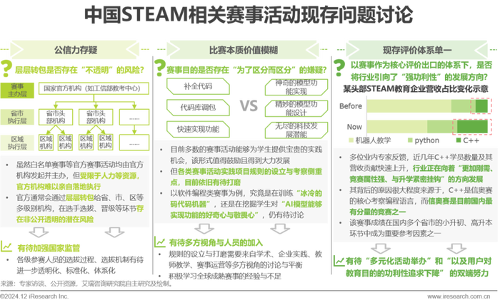 不可否认,赛事活动已经成为发展我国STEAM教育的重要支撑,但其依旧存在问题有待讨论与解决。问题一,官方赛事在真实落地执行过程中存在层层转包现象,因此在选手选拔等环节存在选拔不透明等风险。问题二,比赛本质价值模糊,虽然赛事活动为学生提供了实践机会,但实践质量与考察侧重点仍有待打磨与优化。问题三,现存评价体系单一,同时在商业逐利的推动下,行业正在向着“刚需性、竞赛属性强”的方向发展,有待更多元化活动的举办,也有待全体用户思想的转变。