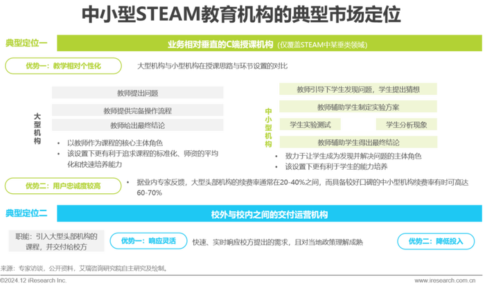 STEAM教育行业目前在国内市场整体呈现集中度较低且机构多元化的特点,因此市场中目前保有众多中小型机构,该类机构目前在市场中主要有两大类定位。第一类典型定位是“业务相对垂直的C端授课机构”,通常该类企业的教学更为个性化,且用户忠诚度较高。第二类典型定位是“校外与校内之间的交付运营机构”,通常该类企业的职能是引入大型头部机构的课程,并运营交付给校方,一方面该类中小型企业响应更为灵活,另一方面可以有效降低企业投入,核心培养运营能力即可。