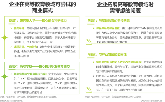 一方面,自2017年起,我国出生人口减少,连锁反应导致基础教育阶段的受众人群减少;另一方面,《全民数字素养与技能发展研究报告(2022年)》中曾提及,当前我国缺乏复合型人才。多方因素综合作用之下,可以为社会培养软硬件复合型人才的STEAM企业开始将目光从基础教育阶段逐步扩展至高教领域,寻找售卖平台、课题共研、产教融合等商业模式,成为企业的新型增长曲线。
