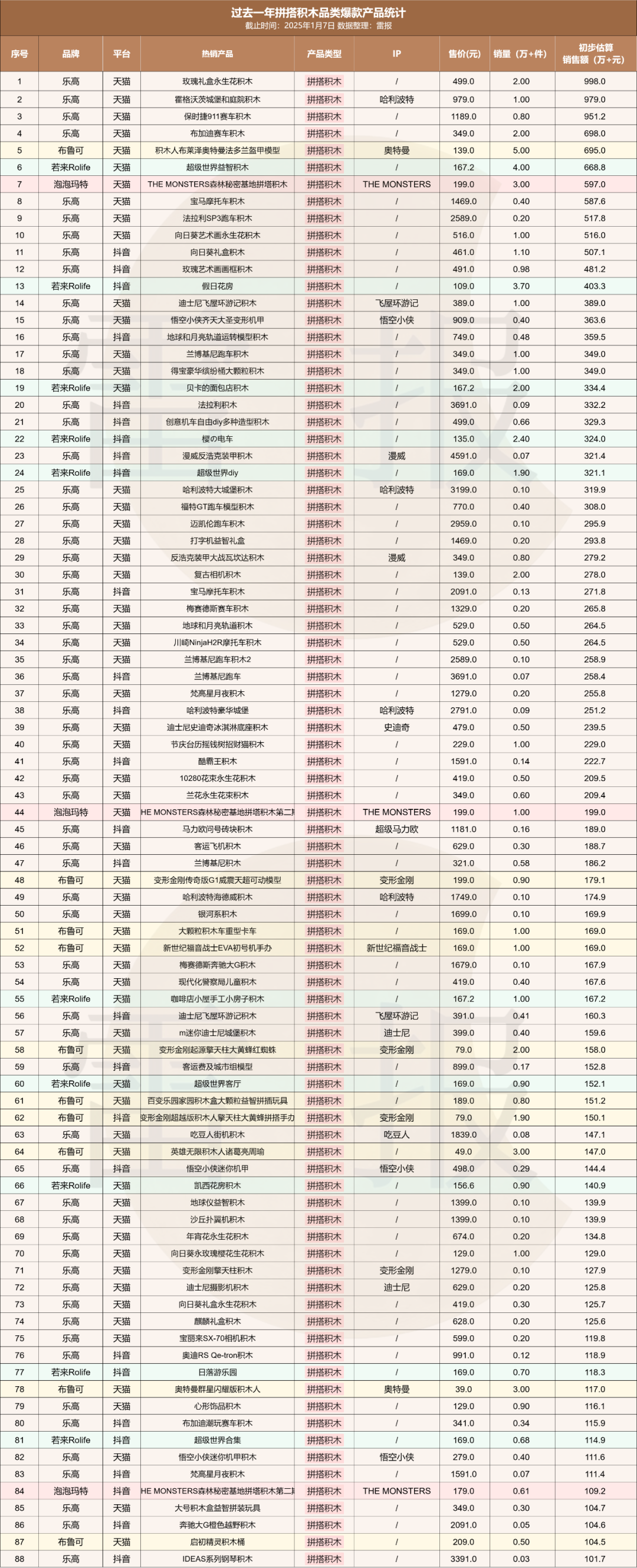 具体来看各产品类型,88款拼搭积木爆款产品来自四个品牌。其中,乐高以65款,高达74%的占比占据绝对的市场份额;若来Rolife和布鲁可则均有10款爆款产品,无疑是该品类下国内目前的头部品牌。泡泡玛特去年也围绕热门Labubu这一热门IP推出两个拼搭积木系列,在IP强大的影响力带动下,也拥有3款爆款拼搭积木产品。