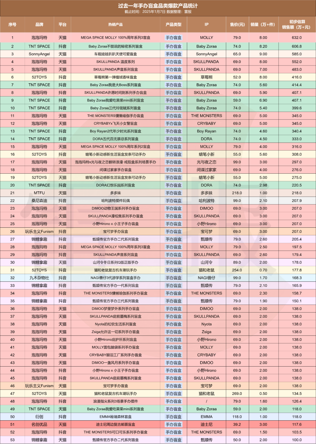 以初步估算的平台销售额为序,进入前十的还有SonnyAngel的车载娃娃趴趴天使可爱盲盒和52TOYS的草莓熊植绒香味盲盒。具体名单如下: