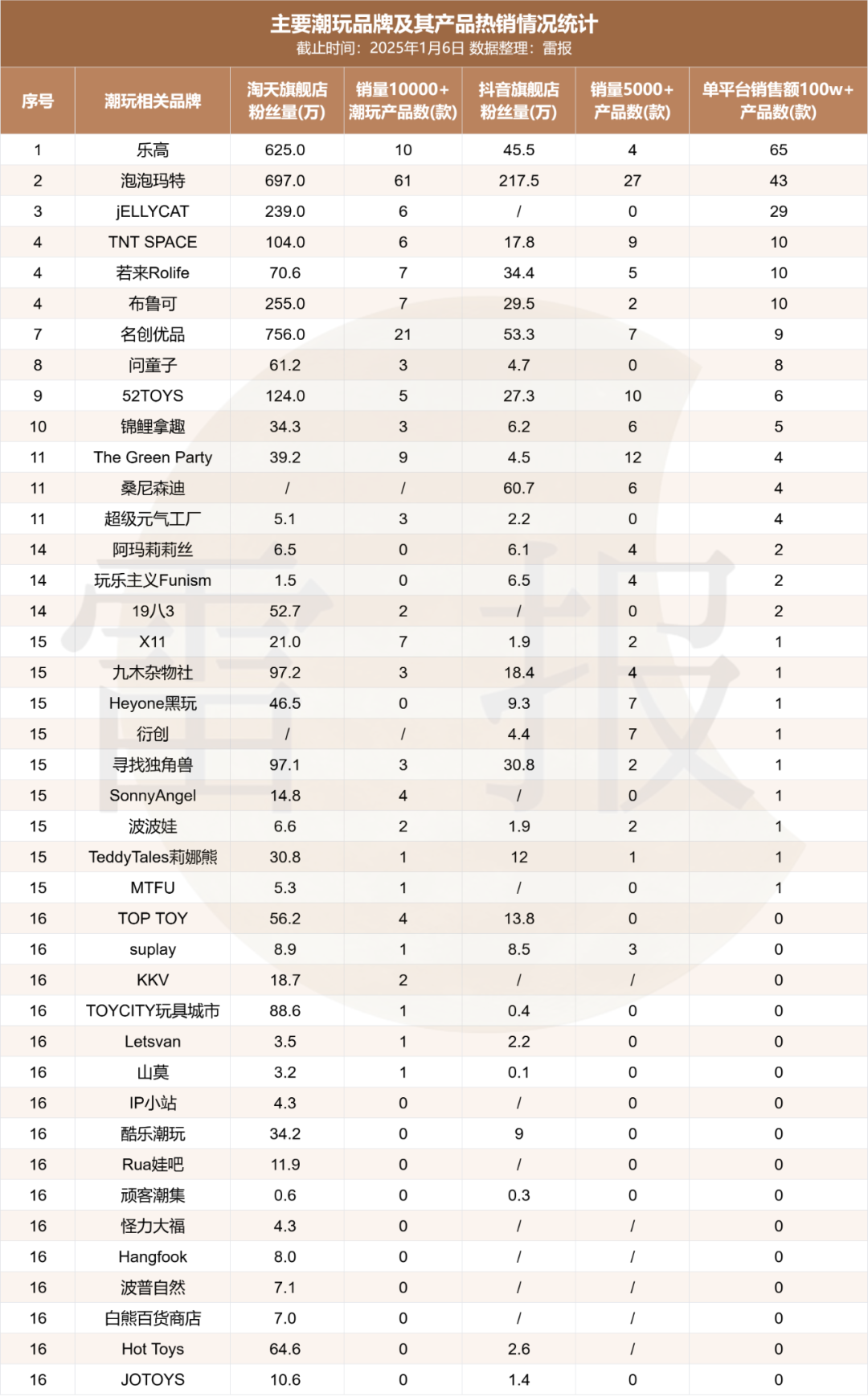 针对潮玩公司及品牌,雷报根据粉丝数量、出圈程度、变现能力、大厂背景、发展潜力等多维度标准,及此前的长期研究,最终确定了41个行业上下游不同类型的潮玩品牌(人工统计存在误差)。同时,由于线下零售数据的不可得,因此主要通过梳理淘宝、天猫及抖音平台官方旗舰店的销售数据对相关品牌进行大致排序。