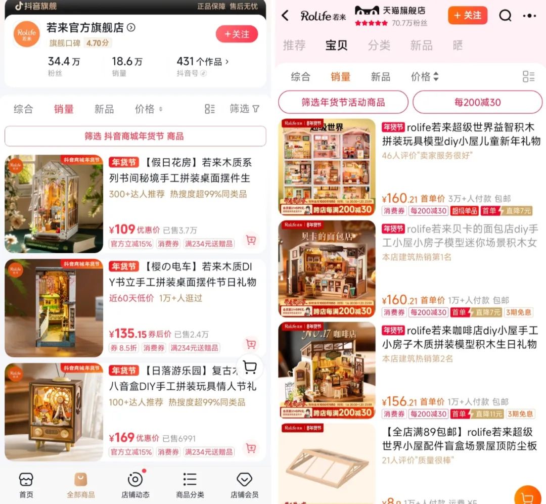 若来Rolife成立于2017年,是ROBOTIME若态集团旗下潮玩品牌,旗下主要有Nanci(囡茜)、Suri(苏蕊)、Yoola(悠拉)等IP。不过,从淘天及抖音的销售数据来看,其过去一年的爆款全部为拼装积木类产品,自有IP中表现最好的是Nanci东方灵瑞系列,在天猫旗舰店销量1w+,按照本文的计算方式预估销售额约为70万。