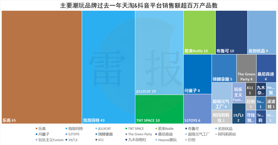 仅以两大平台爆款产品的数量来衡量,过去一年国内潮玩赛道的市场竞争格局大致如下图所示: