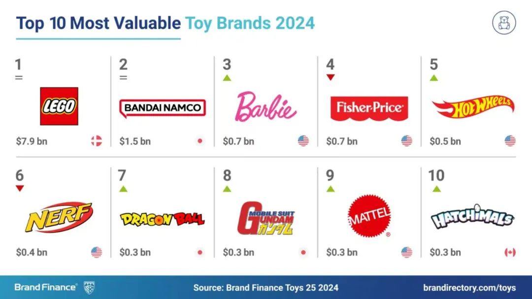去年8月,乐高集团发布的半年度财务报告显示,其24年上半年的营收增长13%,达310亿丹麦克朗(约合人民币315亿元),刷新其上半年的营收纪录;净利润较去年同期增长16%,达60亿丹麦克朗(约合人民币61亿元)。此外,在英国品牌咨询公司Brand Financ发布的2024年全球玩具品牌TOP25榜单中,乐高以79亿美元的品牌价值连续十年蝉联第一名。
