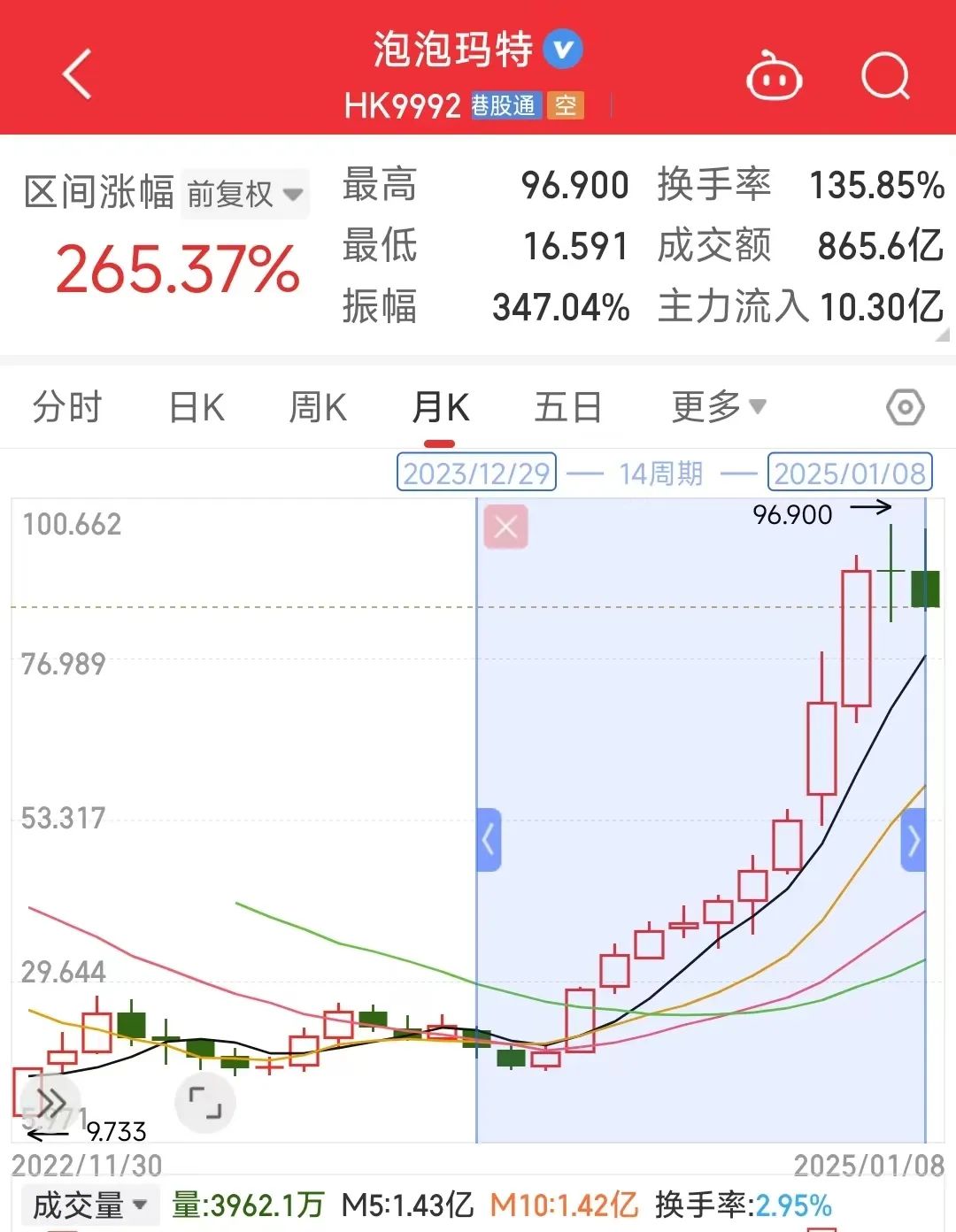在业绩新高的同时,去年一年泡泡玛特的股价也增势喜人,尽管近期有所回落,但从24年年初至今涨幅超过260%。