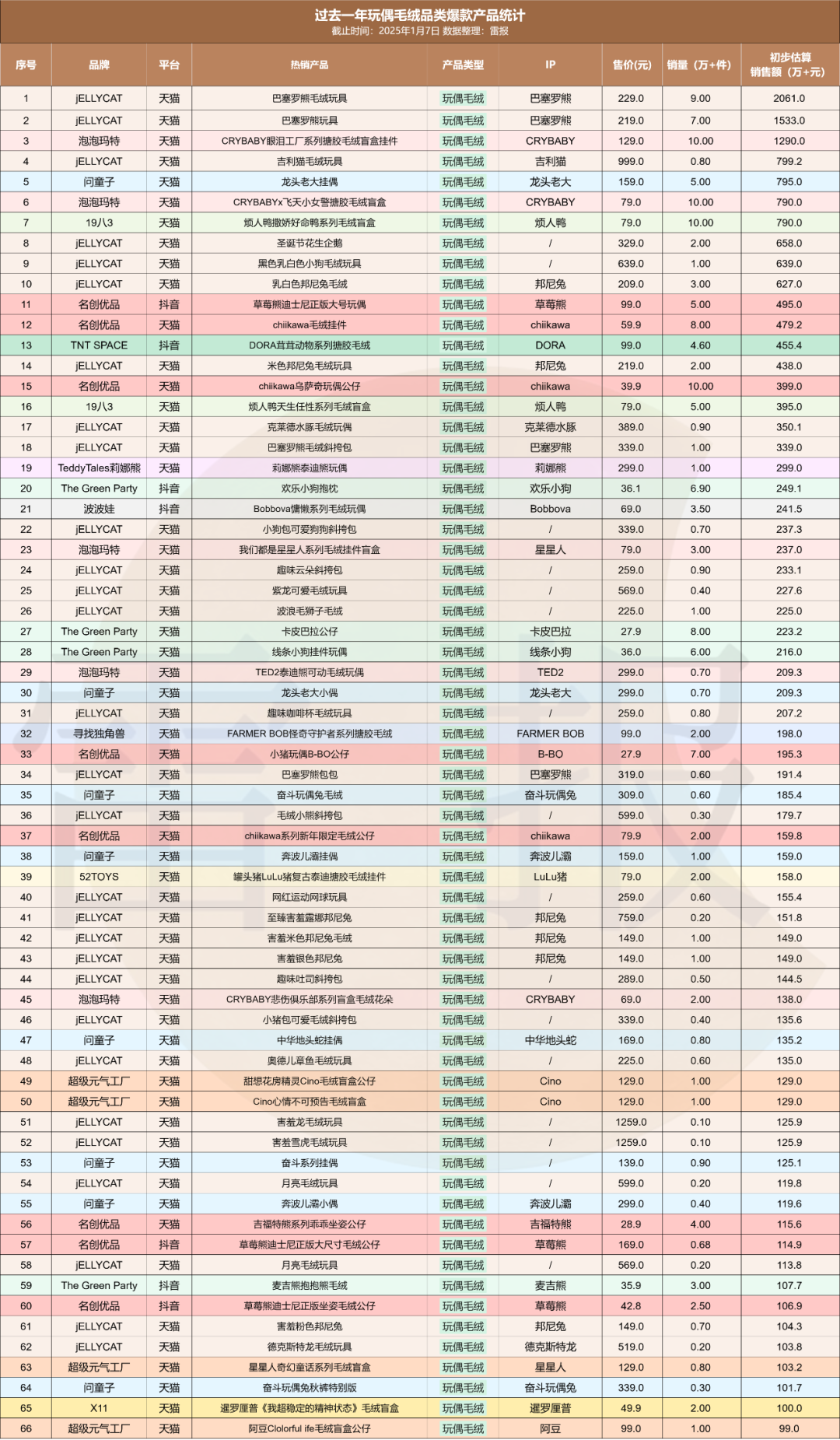 以初步估算的平台销售额为序,单平台销售额超2000万元和1500万元的各有1款,均为jELLYCAT的爆款毛绒——巴塞罗熊毛绒玩具(分别来自天猫jELLYCAT旗舰店和jELLYCAT海外旗舰店);1000-1500万元的共有1款,是泡泡玛特去年11月推出的CRYBABY眼泪工厂系列搪胶毛绒盲盒挂件;销售额500-1000万元的共有7款;200-500万元之间的共有21款;200万元以下的共有35款。