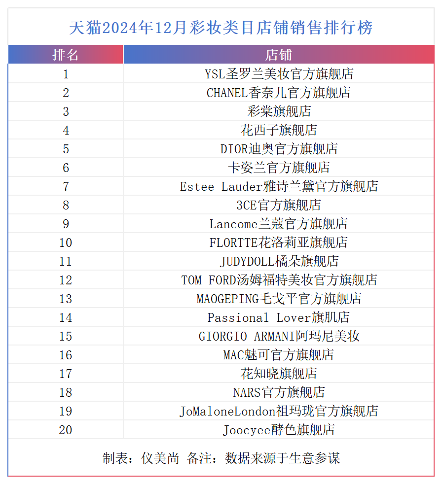 生意参谋后台数据显示,12月,共有彩棠、花西子、卡姿兰、花洛莉亚、橘朵、毛戈平、恋火、花知晓和酵色等9个国货品牌的官方旗舰店闯入天猫彩妆类目TOP20榜单。不过,其中只有彩棠和花西子闯进榜单TOP5,其余三席均为外资美妆品牌,TOP1和TOP2更是被YSL圣罗兰和香奈儿拿下。