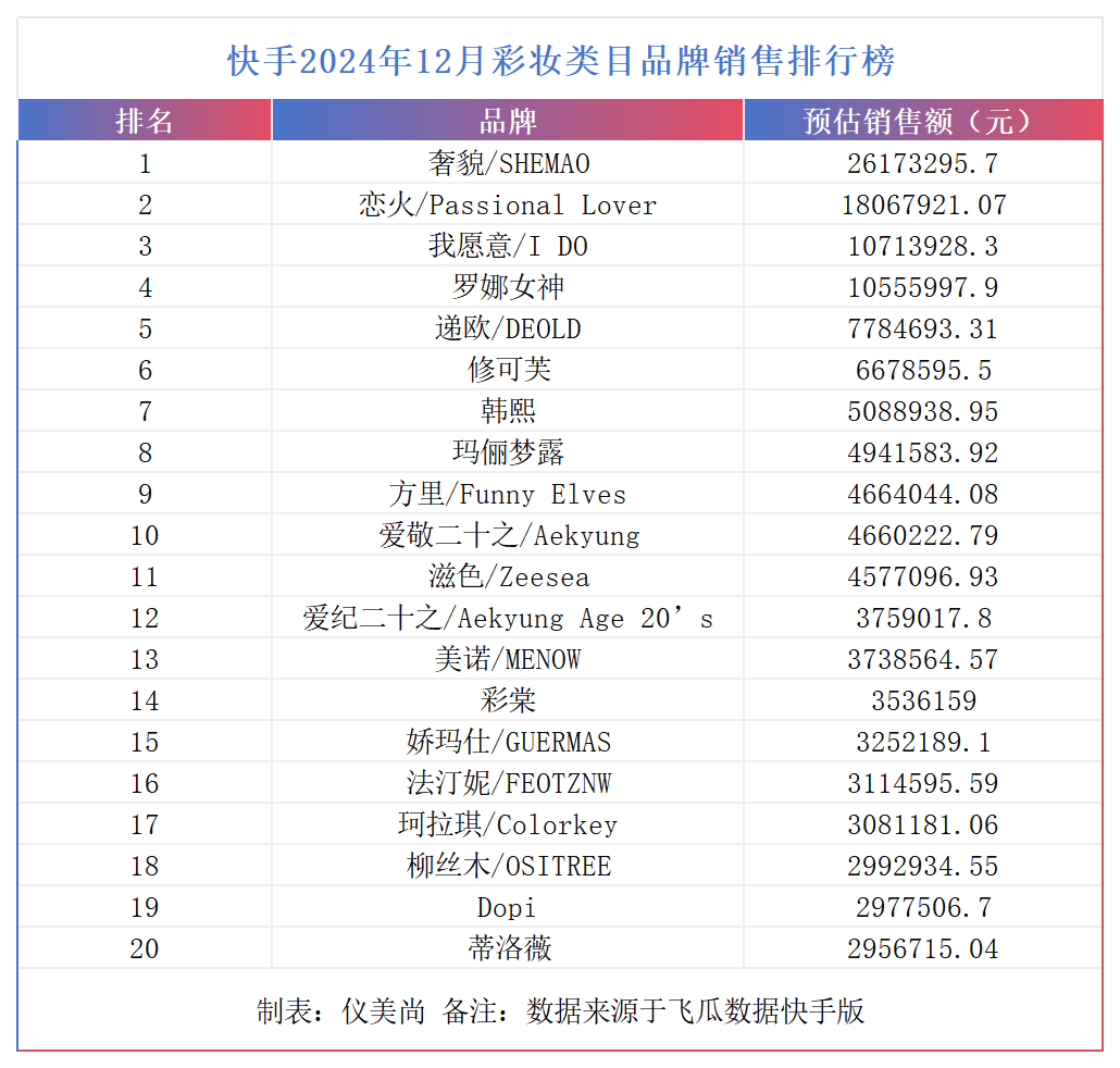 快手TOP20彩妆品牌的预估总销售额为1.3亿元,比11月份的9050万元,大幅增长了43.6%。其中,销售额破千万的品牌是排名在榜单前四位的奢貌、恋火、I DO和罗娜女神。