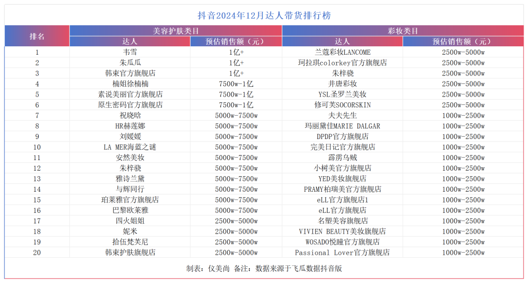 细数达人带货榜,12月,在抖音美容护肤类目,共有韦雪、朱瓜瓜、韩束官方旗舰店、徐楠楠、素说美丽官方旗舰店和原生密码官方旗舰店6个达人账号的预估销售额达到1亿元。