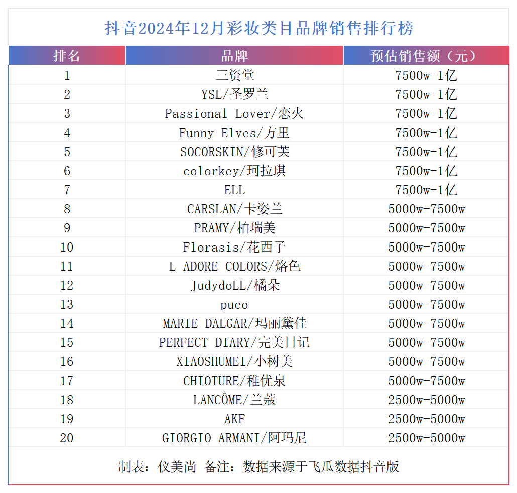 飞瓜数据显示,12月,抖音电商预估销售额达到1亿的彩妆品牌中,仅有YSL一个国际品牌,其余6个均为国货——三资堂、恋火、方里、修可芙、珂拉琪和ELL。而登上TOP20榜单的国货,总量高达16个。