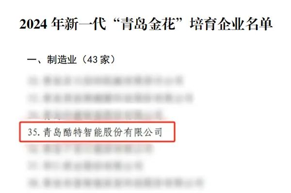 近日,青岛市工业和信息化局、青岛市发展和改革委员会、青岛市农业农村局联合发布《2024年新一代“青岛金花”培育企业名单》。在制造业领域,包括酷特智能在内的43家企业成功入选,彰显了青岛市制造业的深厚内功。