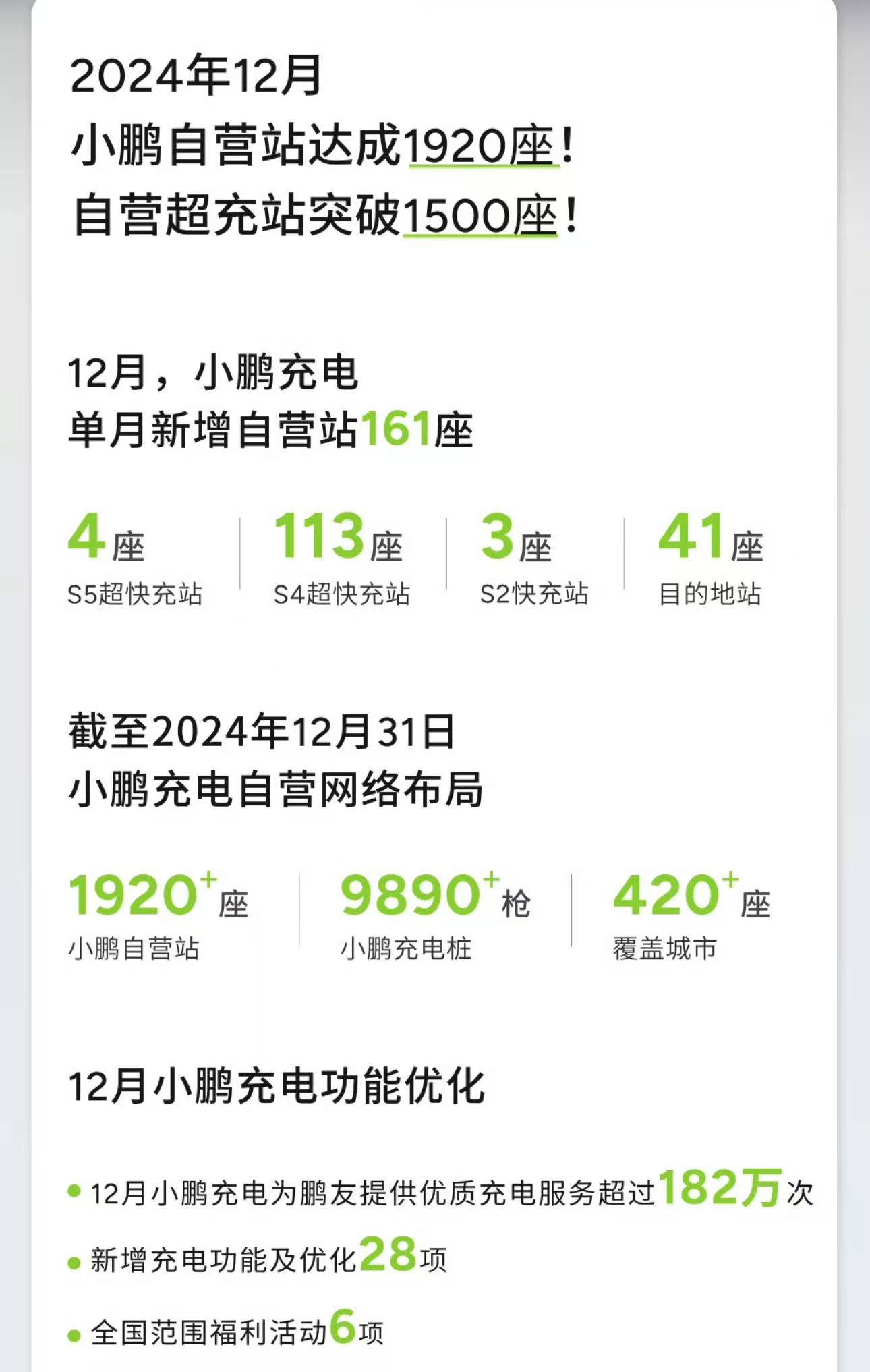 小鹏汽车官博1月9日消息,2024年12月,单月上线161座自营站,上线速度打破历史记录;小鹏自营站达成1920座,自营超充站突破1500座。