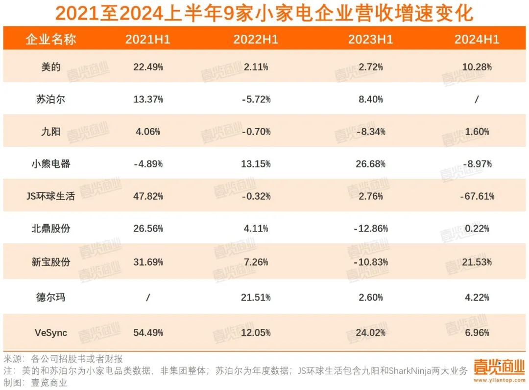 从美的、九阳、小熊电器、JS环球生活等8家上市企业的中报以及苏泊尔的年报看,对比2021年,行业营收增速整体放缓,小熊电器、JS环球生活更是在今年上半年出现了负增长。