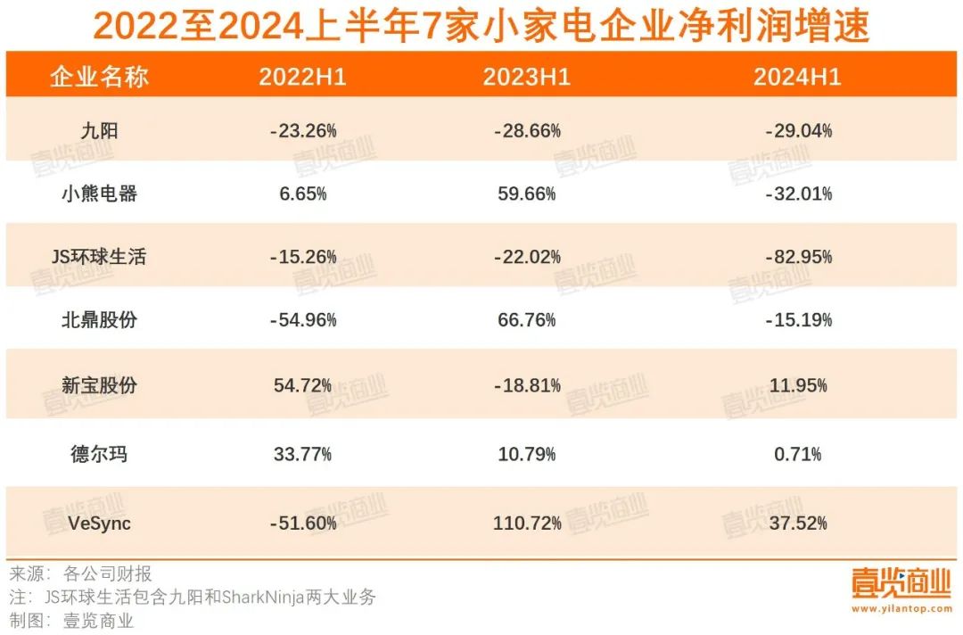 销量的下跌也影响着净利润的表现。刨去未公布小家电品类净利润的美的与苏泊尔两家企业后,2024上半年财报显示,九阳、小熊电器、JS环球生活、北鼎股份净利润全部下滑,JS环球生活净利润更是同比下降了超八成。仅有VeSync净利润保持30%以上的增速。