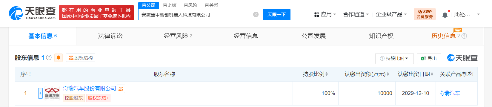 据每日经济新闻消息,天眼查App显示,近日,安徽墨甲智创机器人科技有限公司成立,法定代表人为张贵兵,注册资本1亿元,经营范围含智能机器人销售、智能机器人的研发、工业机器人销售、智能基础制造装备制造、人工智能应用软件开发、人工智能基础软件开发、信息系统集成服务、智能控制系统集成等。股东信息显示,该公司由奇瑞汽车股份有限公司全资持股。