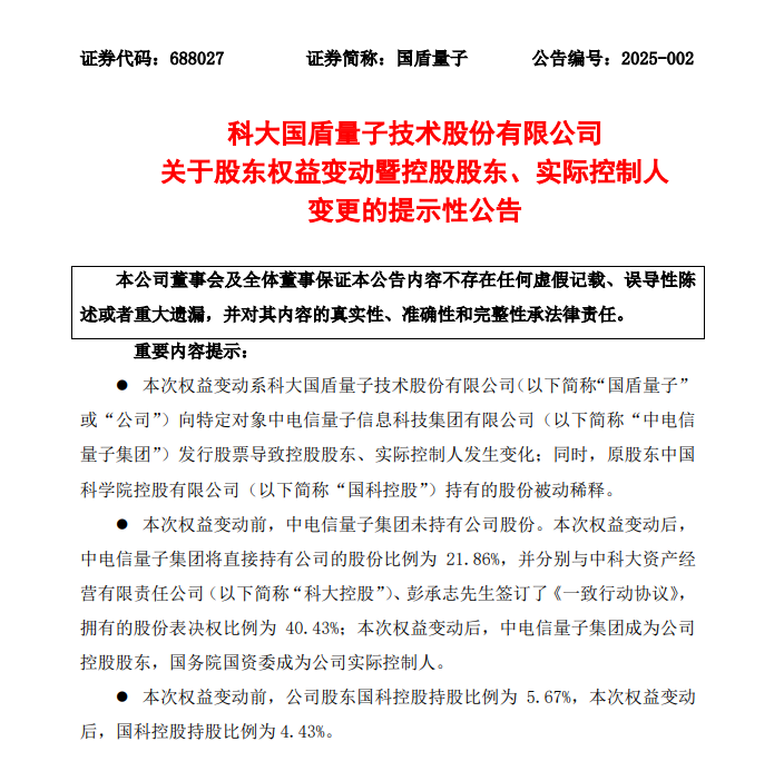2025年1月8日,国盾量子发布公告,公司控股股东、实际控制人发生变化,中电信量子集团成为公司控股股东。并分别与科大控股、彭承志先生签订了《一致行动协议》,拥有的股份表决权比例为 40.43%。本次权益变动后,原股东中国科学院控股有限公司(以下简称“国科控股”)持有的股份被动稀释。持股比例由5.67%变动为4.43%。