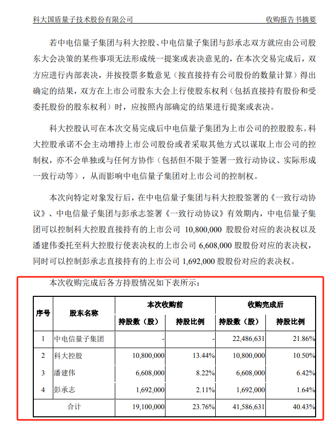 收购完成后,国盾量子各方的持股情况为,中电信量子集团持股21.86%,科大控股持股10.50%,潘建伟持股6.42%,彭承志持股1.64%。