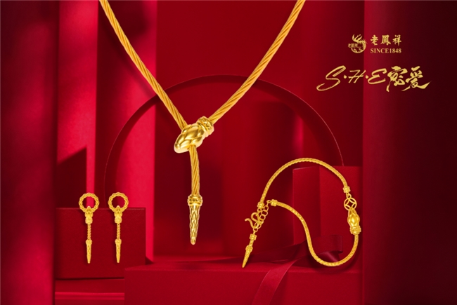 比如很多人都有年节时买金饰的习惯,用以辞旧迎新。乙巳蛇年在即,老凤祥就通过对灵蛇元素的创新演绎,带来了匠心之作——S.H.E宠爱系列。