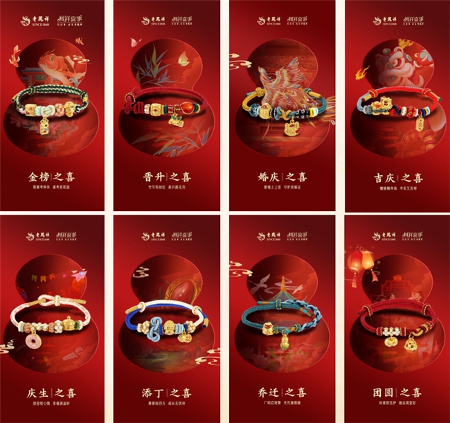 比如凤祥喜事·人生八喜系列,其将“婚庆、添丁、金榜、晋升、庆生、乔迁、吉庆、团圆”八大中国传统喜韵与非遗绳结工艺结合,在可定制的绳结中加入代表不同庆祝场景的金饰配件,令灵活设计和古朴韵味完美融合。