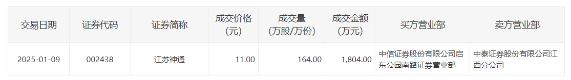 江苏神通1月9日大宗交易成交164万股,成交额1804万元,占当日总成交额的7.35%,成交价11元,较市场收盘价12.75元折价13.73%。