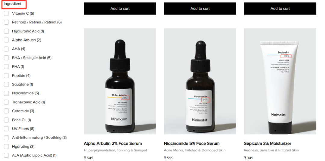 据了解,Minimalist最突出的特点在于D2C销售模式和主打功效活性成分。从Minimalist官网可以看到,该品牌旗下大部分产品均在包装外侧标注了料体主要成分的浓度及功效。不仅如此,该网站还单独设置了成分选择栏,其中包括维生素C、视黄醇、透明质酸、肽等,消费者可以通过筛选成分以购买不同功效的产品。