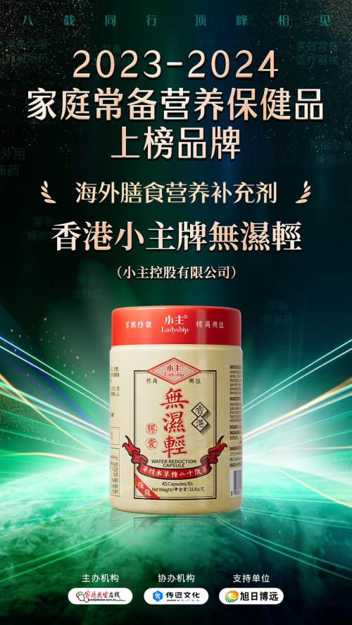 本次评选共经历了初步审核、大数据及市场调查赋分、大众投票得分、产品公示等环节,以保證上述榜单的指导性、大众性、合理性和公正性,更好地为广大家庭服务。在众多参评产品中,香港小主系列产品无湿轻凭借其卓越的保健效果和广泛的市场认可,荣登“2023-2024家庭常备药上榜品牌”海外膳食营养补充剂榜单,并摘得“上榜品牌”称号,充分肯定了小主系列产品在质量保證、品牌实力和市场信誉方面的卓越成绩。