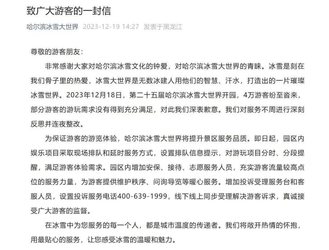 最重要的是,冰雪大世界非常“听劝”。去年的冰雪大世界因为超高热度提前开园,导致入园人数远超游乐园承载量,游客被迫在零下20℃的户外“罚站”几小时,纷纷要求“退票”。