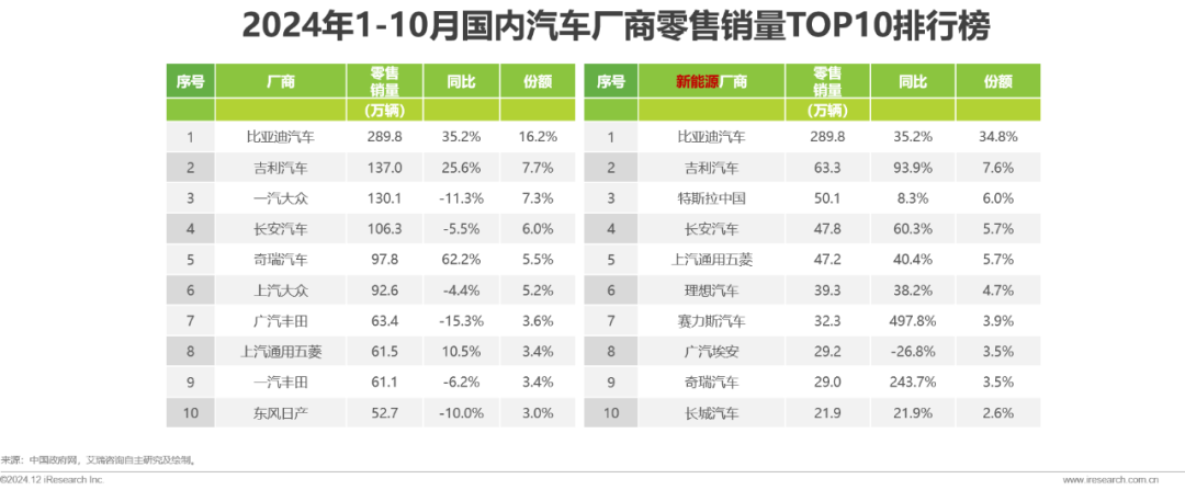 2024年,国家有关部门通过智能网联汽车试点、新能源汽车贸易合作等政策,推动汽车技术创新与市场拓展;地方政府则以财政奖补、以旧换新等活动激发汽车消费活力。在政策合力下,汽车行业转型加速,新能源厂商积极跟进,凭借其技术、产品等优势,市场份额持续扩大,其中比亚迪1-10月零售销量达289.8万辆,位居整体及新能源细分市场榜首,领航汽车行业电动化转型进程。