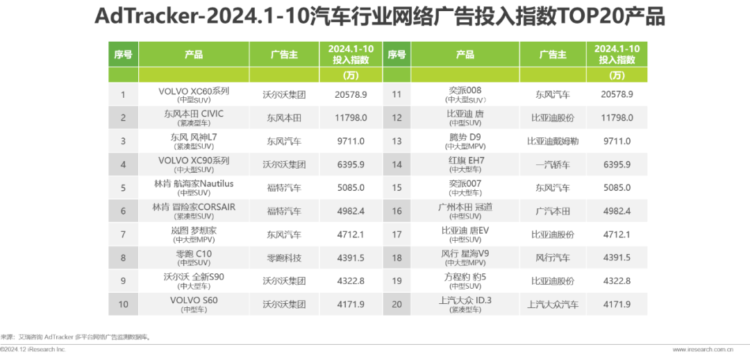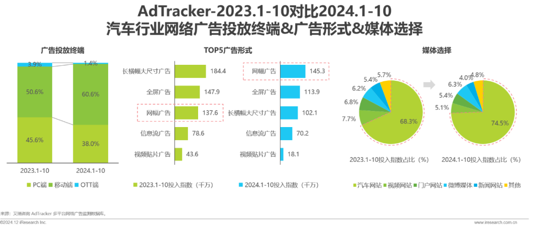 投放策略方面,2024年1-10月,汽车行业移动端广告投入占比对比2023年同期提升10.0%,移动互联网于汽车营销领域的重要性进一步巩固;网幅广告取代长横幅大尺寸广告,成为车企投放首选;网络广告投入指数超过七成集中于汽车网站,表明其在汽车行业广告投放中具核心地位。