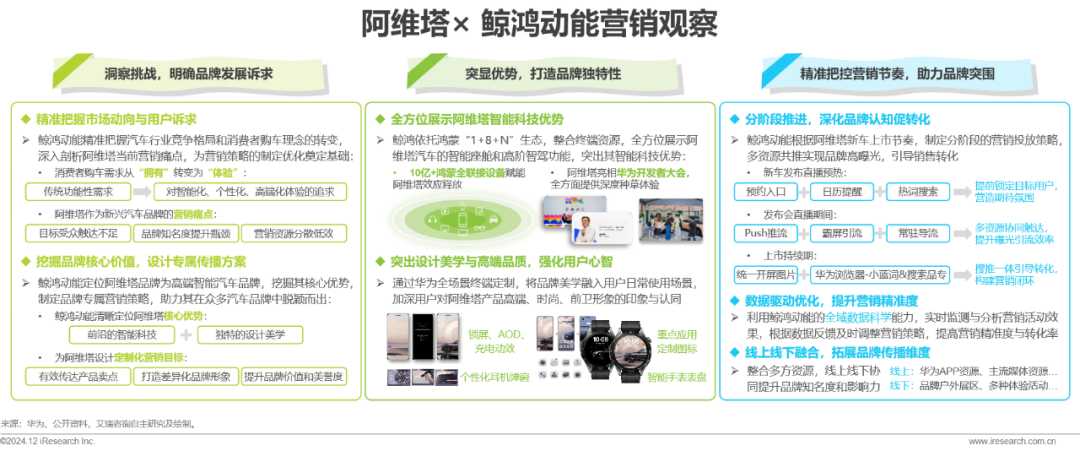 鲸鸿动能依托对汽车行业的敏锐洞察和消费者行为的深入理解,为阿维塔打造了覆盖全营销周期的解决方案,实现了线上线下资源的无缝融合。借助鸿蒙生态的深度赋能,鲸鸿动能将阿维塔的智能科技和设计美学优势精准传达给目标客群,同时运用前沿技术对用户进行细分,实现个性化沟通和精准营销,提升用户参与度和品牌忠诚度,为阿维塔在市场中的差异化竞争提供了坚实支持。