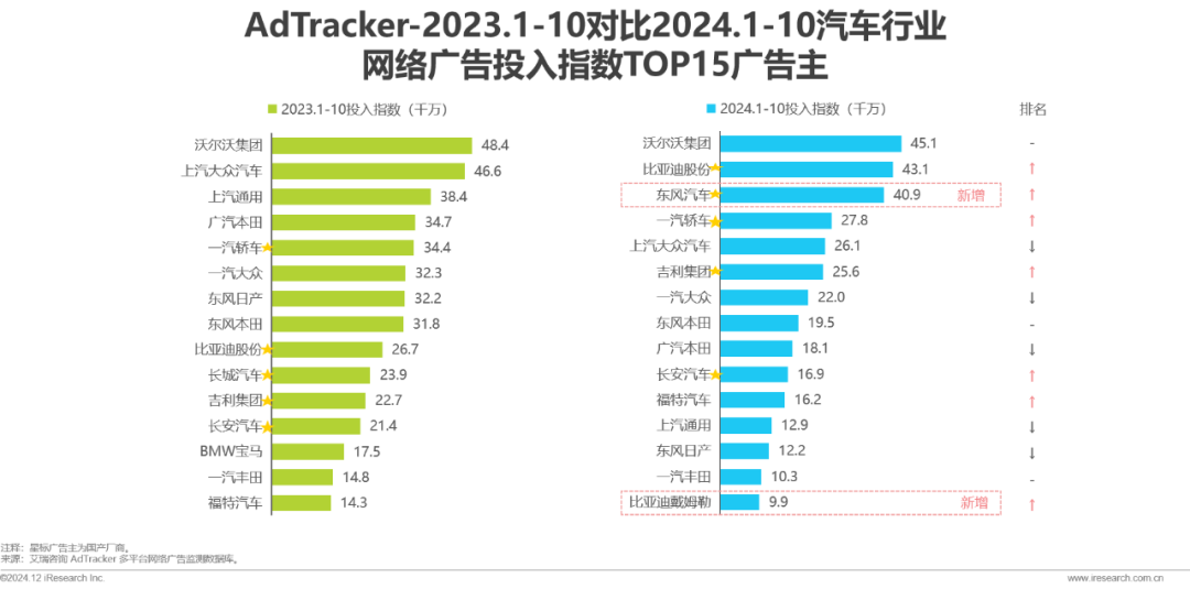 自主品牌崛起,营销投入和市场份额双提升:国产自主品牌在技术和产品方面不断进步,市场份额稳步攀升,营销投入也显著增加。行业TOP广告主中,比亚迪、吉利等国产厂商积极布局营销推广,以进一步提高品牌影响力和市场竞争力,网络广告投入指数位居前列。