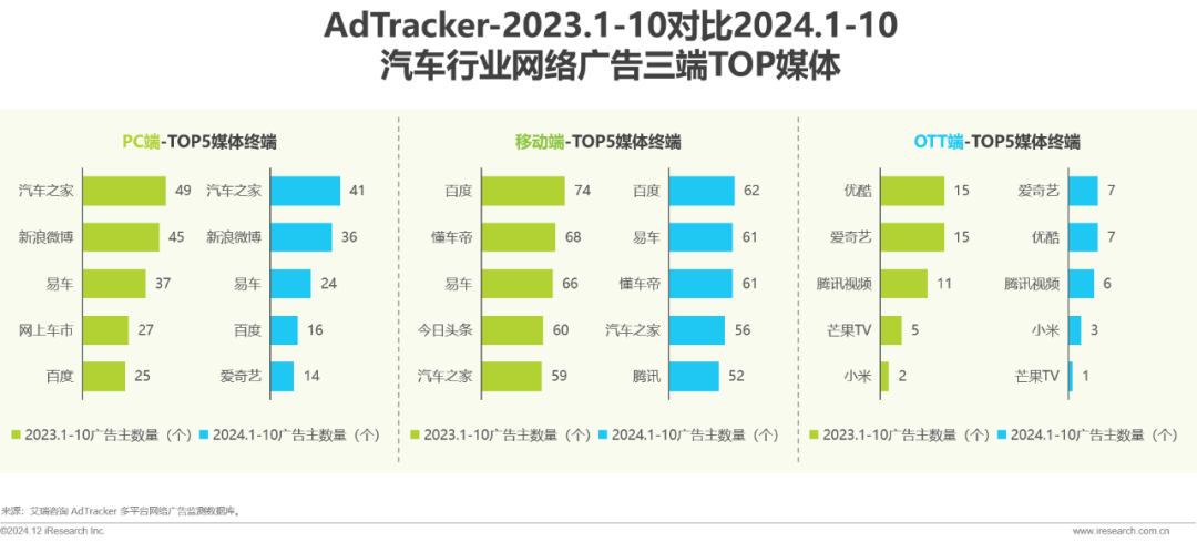 2024年1-10月,三端TOP媒体的广告主数量较去年同期有所缩减。广告主依据营销目标及受众画像,在不同终端实施差异化媒体布局,其中汽车之家在PC端保持领先地位,百度在移动端占据首位,而OTT端则以爱奇艺和优酷的广告主数量最多。