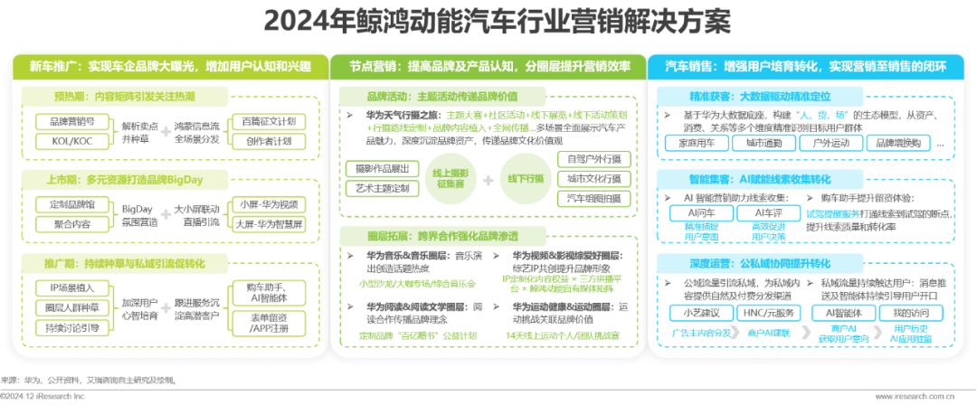 鲸鸿动能为汽车行业广告主提供三大核心营销解决方案。新车推广层面,鲸鸿动能整合多元资源精准种草新车卖点,实现从预热到推广的全方位品牌曝光与潜客沉淀;节点营销方面,通过线上+线下的整合营销与定制化资源的分圈层定向突破,全面提升营销效率与效果;汽车销售环节,依托华为领先的大数据及AI等能力,精准获客、智能集客,公私域协同运营引导转化,完成从营销到销售的闭环,助力广告主销售目标达成。