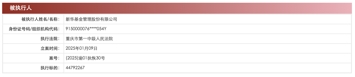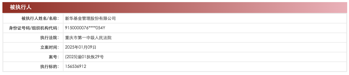 中国执行信息公开网显示,1月9日,新华基金管理股份有限公司新增两则恢复执行信息,执行标的合计2亿余元,执行法院为重庆市第一中级人民法院。