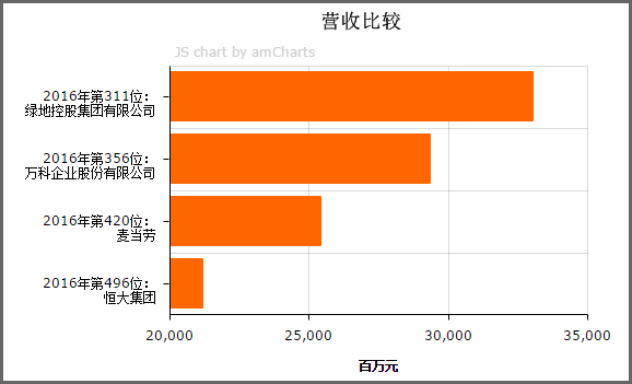 按照营收排名的2016年《财富》世界500强榜单上,绿地排名第311位,万科排第356位,麦当劳排第420位。