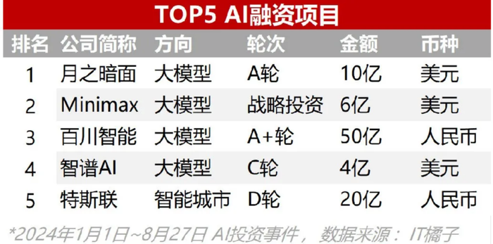 桔子IT数据显示,2024年前9个月,国内AI领域发生了317起融资案例,月均融资金额42亿元,不到去年的两成。其中,融资最多的5家公司拿走了超212亿,相当于今年国内AI融资总额的63%。
