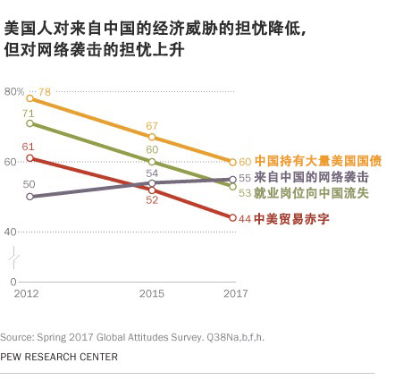 近年来,认为中国所持美国国债、就业岗位向中国流失,以及和中国的贸易赤字是非常严重问题的美国公众占比明显下降。例如,在2012年,有61%的美国人认为贸易赤字是个很严重的问题,而今天的这一比例只有44%。