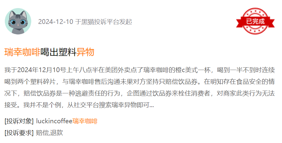 伴随着咖啡品牌们的疯狂扩张,它们的品控问题也逐渐浮现。在黑猫投诉平台上,瑞幸咖啡相关的投诉接近1.4万条,星巴克有6200多条,库迪也有接近1500条,其中“咖啡中喝出异物”的帖子屡见不鲜。