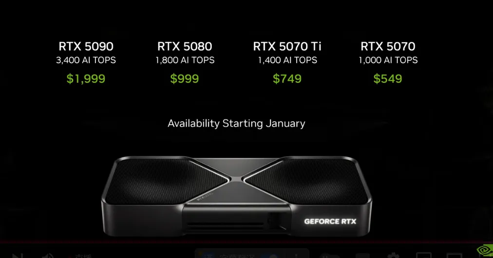 RTX 5090售价1999美元;RTX 5090D(RTX 5090显卡不在国内市场开售,仅提供性能相近的RTX 5090D)旗舰显卡国行价16499元起。此外,RTX 5080、RTX 5070 Ti和RTX 5070的售价分别为999美元(国行8299元起)、749美元和549美元。据说,售价549美元的5070将提供与此前售价1599美元的RTX 4090相同的性能。