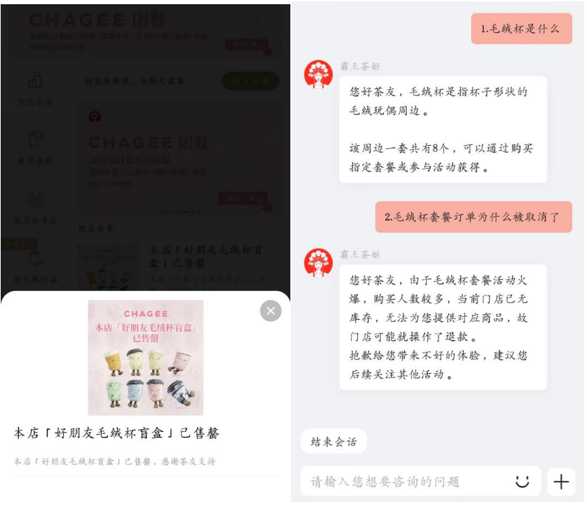 2025年伊始,霸王茶姬推出了一个“CHAGEE好朋友1+1套餐”,内含一杯饮品和一个类似Jellycat玩偶形象的毛绒杯盲盒,售价49.9元。由于玩偶周边大受欢迎,该套餐在多地门店火速售罄。