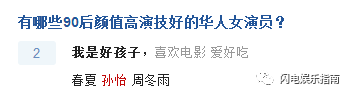 在一篇名为《有哪些90后颜值高演技好的华人女演员?》的讨论贴下,有人把孙怡和周冬雨并列放在一起,是不是总感觉有个名字很突兀啊?大家都知道周冬雨,那只鸭子嘛,我经常给小朋友送那个礼物,但是孙怡?好吧,勉强说你像鲸鱼吧。