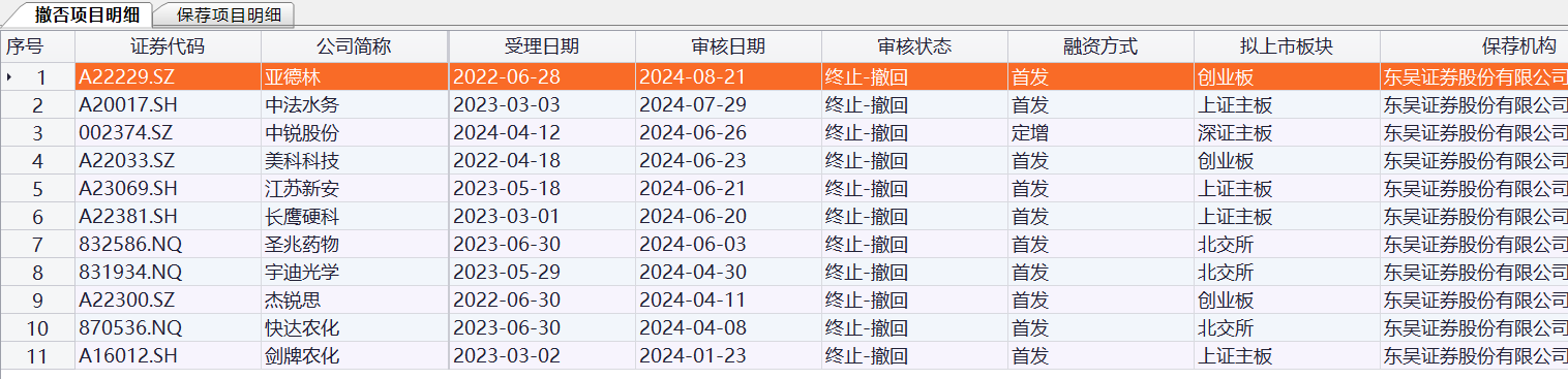 根据Choice金融终端,东吴证券2024年保荐项目共18个,其中11个主动撤回,撤否率超60%。2024年1月,剑牌农化IPO项目撤单。值得关注的是,2021年12月,东吴证券两名保荐代表人冯颂、李强因在剑牌农化IPO项目执业过程中未能勤勉尽责,对发行人应收票据等事项核查不充分,被中国证监会出具警示函。