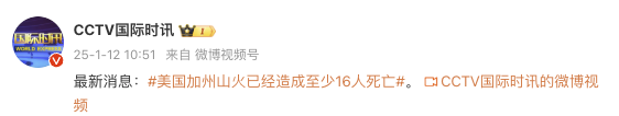 据@CCTV国际时讯 微博,美国加州山火已经造成至少16人死亡。
