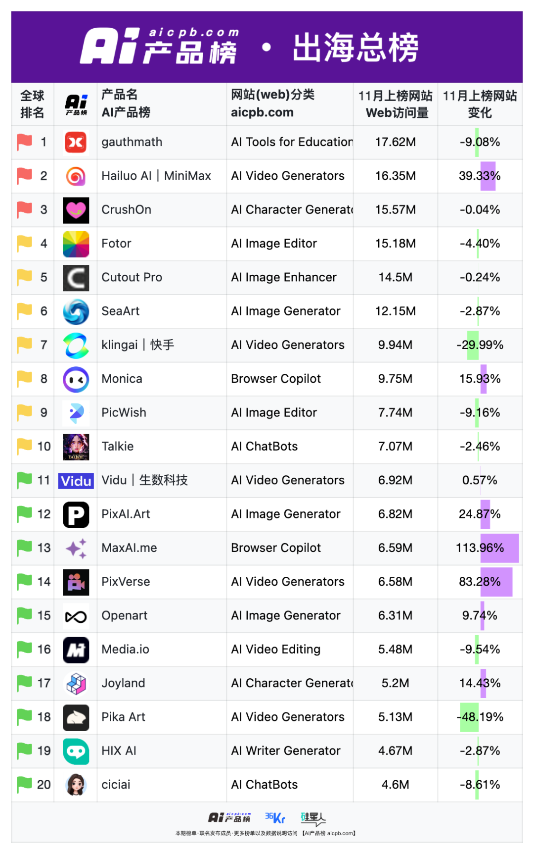 快手在13岁生日当天发布了视频大模型可灵,能够让内容创作者,从简单文本到精彩视频,无论创作数量和质量都让中国AI能力走在了世界前列;脱胎于字节跳动的爱诗科技,要做AI时代的超级内容平台,核心产品PixVerse全球用户数已超1200万;依托于全球首个Diffusion Transformer架构,生数科技也是内容生成软件的爆款产品。